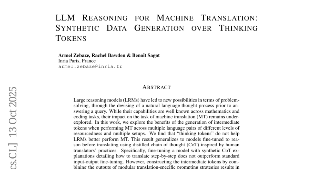 LLM Reasoning for Machine Translation: Synthetic Data Generation over Thinking Tokens